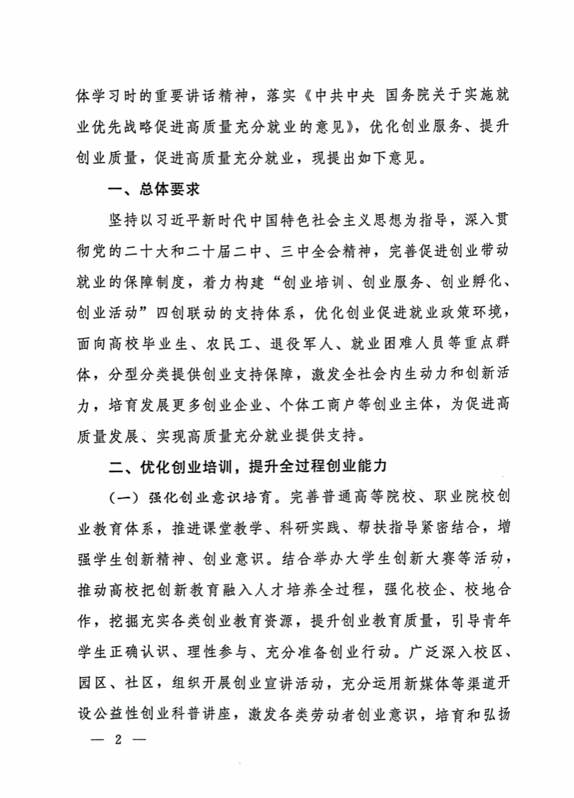 为深入学习贯彻习近平总书记在中共中央政治局第十四次集体学习时的重要讲话精神,落实《中共中央国务院关于实施就业优先战略促进高质量充分就业的意见》,优化创业服务、提升创业质量,促进高质量充分就业,现提出如下意见。
